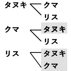 | タヌキ | \ | タヌキ-クマ | タヌキ-リス |