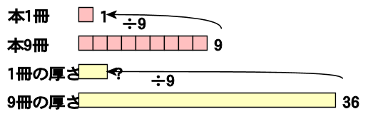 9冊並べたら36cmの棚(たな)がいっぱいになりました。