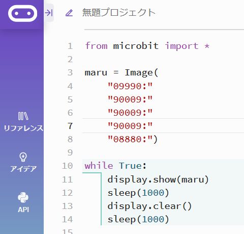 解説するとこんな感じです| from microbit import * #フロムマイクロビットインポート #おまじない maru = image( ”09990:" ”90009:" ”90009:" ”90009:" ”08765:") While True: #ホワイルテゥルー ずっと繰り返せ display.show(maru) #まるを表示しなさい leep(1000)