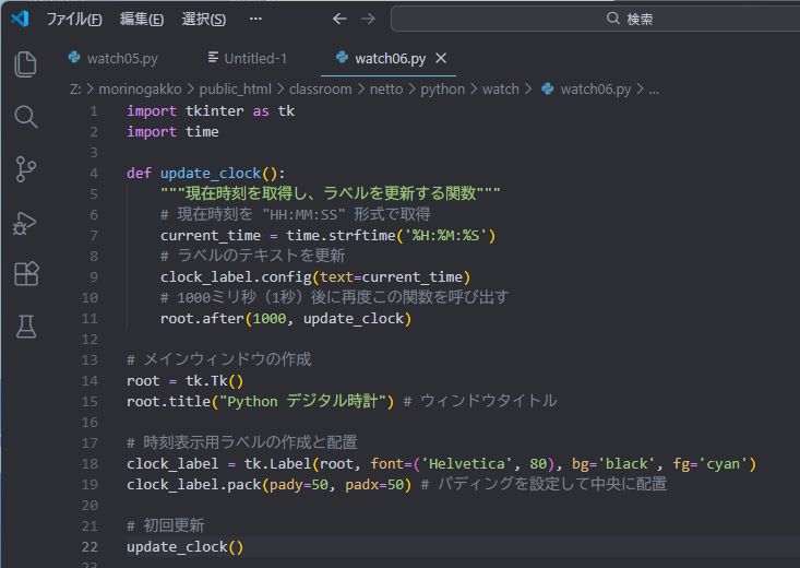 これはクロームに、pythonで時計を作って といって作ってもらったものです。僕も詳しくないので詳しい説明をつけながらお勉強です。