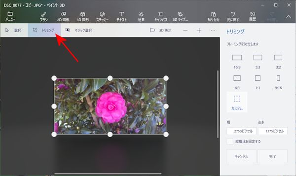 そうしたら、下の線や横の線を、●のマークを押して動かし、完了を押せばトリミング完了です。