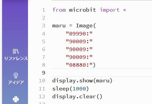解説するとこんな感じです| from microbit import * #フロムマイクロビットインポート #おまじない maru = image( ”09990:" ”90009:" ”90009:" ”90009:" ”08765:") While True: #ホワイルテゥルー ずっと繰り返せ display.show(maru) #まるを表示しなさい leep(1000)