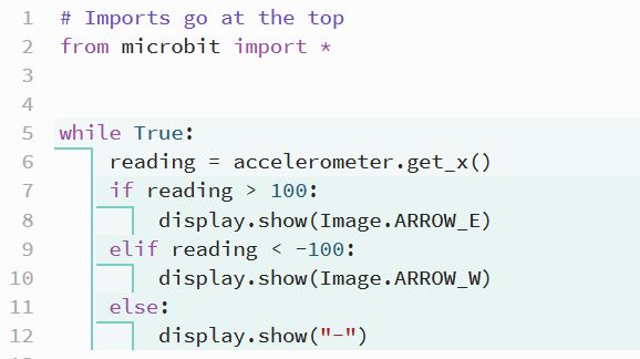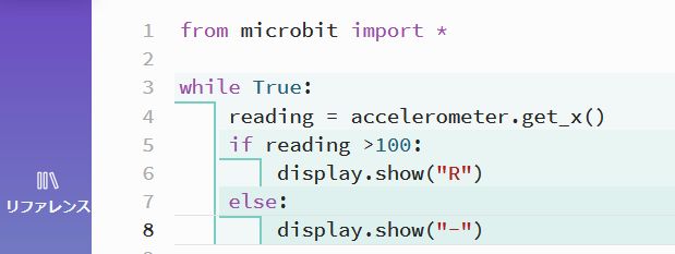 | reading = accelerometer.get_x() | 加速度センサーでx方向(左右方向)にどれだけ傾いているか調べて リーディングという変数に保存します |