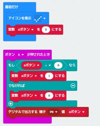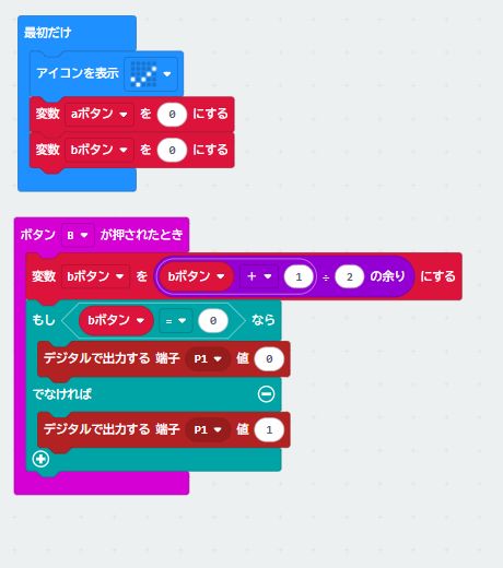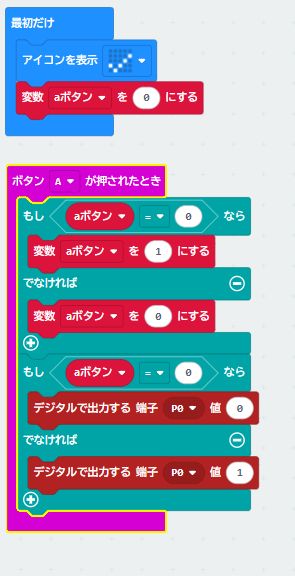aボタンが押されるたびに、変数[aボタン]は1になったり0になったりします。