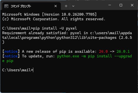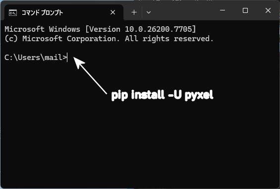 そしたら pip install -U pyxel とかくそしてエンターキー(Enter)を押すと