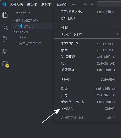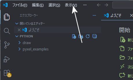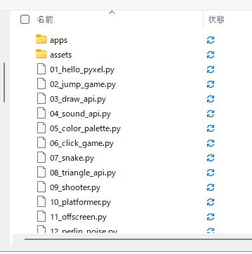 ファイル → ファイルを開く として pythonフォルダの pyxel_examples を開くと(開くにはダブルクリック、もしくは右クリックをして「開く」を押す)
