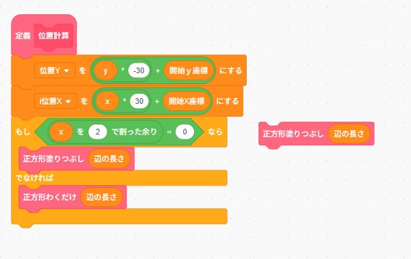 正方形塗りつぶしの部分を変えますxが偶数のときは黒塗り、奇数のときは白塗りにします