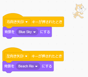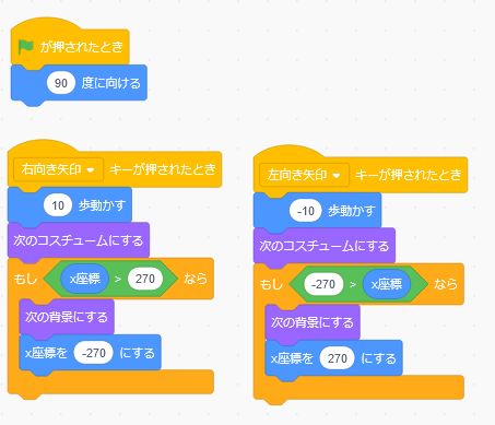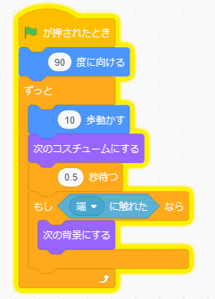 これで、次々と背景が変わって、スプライトがどんどん進んでいくようになります。