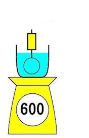 それに、水の入った袋にバネばかりをつけ、水の中に入れました。