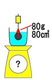 重さ100g、体積80㎤の金属のおもりをバネばかりにつるしてを入れました。