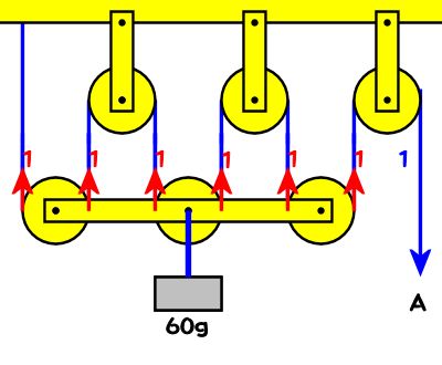 図のように定滑車3つと動滑車が3つ組み合わせてあります。