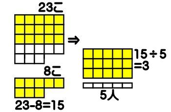 残(のこ)りを5人で同じように分けると、一人何こになるでしょう。