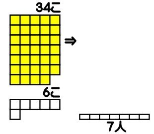 残(のこ)りを7人で同じように分けると、一人何こになるでしょう。
