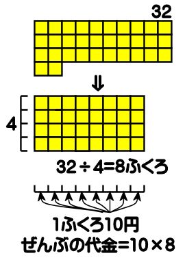 これを4こずつふくろに入れて、1ふくろを10円でうります。