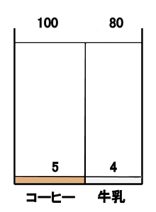 コーヒー牛乳を作るのに、コーヒー100mlと牛乳80mlをまぜました。