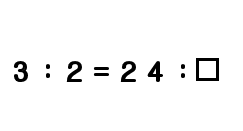 3:2=24:x を解くと、xはいくつ?解き方はいろいろあるけれど、次の解説では、内項と外項の積は等しいから