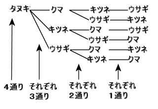 クマ それなら、何通り並び方があるか考えて、順番に並び方をかえていこうよ。