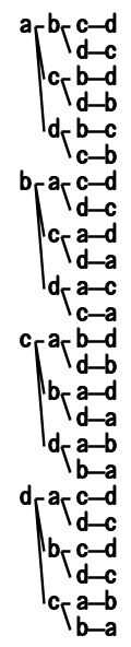 一番最初に並ぶのは、aまたはb,c,dの4通りです。