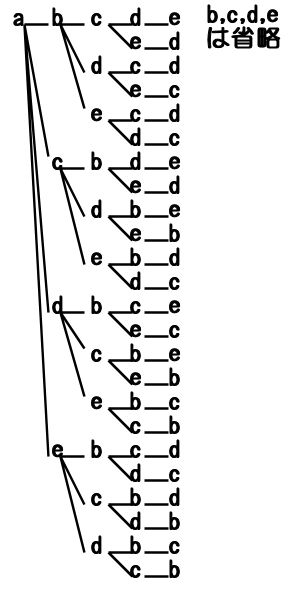 一番最初に並ぶのは、aまたはb,c,d,eの5通りです。
