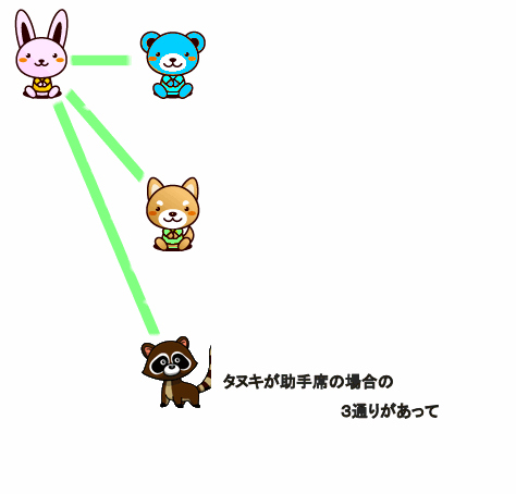 では、ウサギが運転手で、クマが助手席のとき、うしろの席のすわり方は何通り。