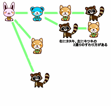 では、ウサギが運転手で、クマが助手席のとき、うしろの席のすわり方は何通り。