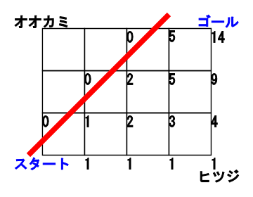 また、赤い線より上の進み方は、オオカミの方が多くなるから通れません。