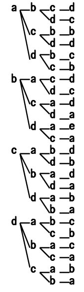 一番最初に並ぶのは、aまたはb,c,dの4通りです。