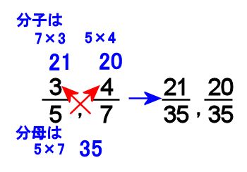 おたがいの分子に分母を × のようにかけるので、たすきがけといいます。
