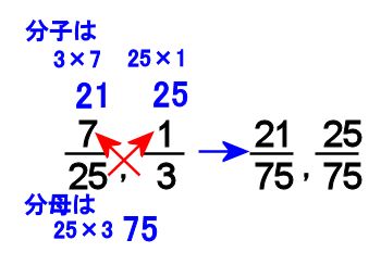 おたがいの分子に分母を × のようにかけるので、たすきがけといいます。