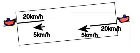 川の流れは時速5kmです。 ここを、静水時の早さが時速20kmの舟で往復すると何時間かかりますか。