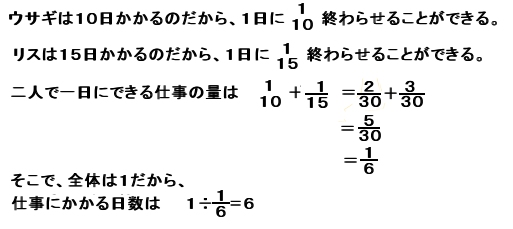 この仕事は、ウサギだけだと10日かかり、リスだけだと15日かかります。