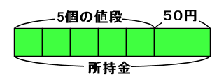 また、同じ金額でミカンを5個買うと50円のおつりが出ます。