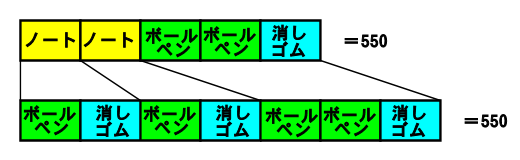 リス ほら ノート一冊をボールペンと消しゴムに書き直すと下の図になるね。
