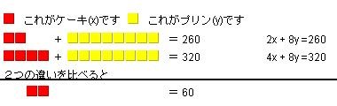 ケーキ2個とプリン8個の代金は 260円