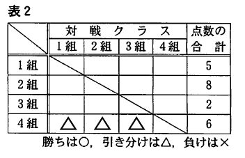 表2は、6年生の対戦用です。 4クラスが、それぞれどのクラスとも1回ずつ当たるように試合をしました。 勝ち、引き分けによって、与えられる点数は5年生と同じです。 点数の合計をもとに、表2に○△×を書き入れて表を完成させなさい。