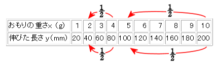 重さxが1/2(2分の1)になったら、伸びた長さも1/2になります。