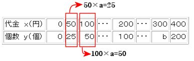 | 個数 y(個) | 0 | 25 | 50 | ・・・ | 100 | ・・・ | b | 200 |