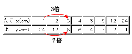 | よこ y(cm) | 24 | 12 | 8 | 6 | 4 | 3 | 2 | 1 |