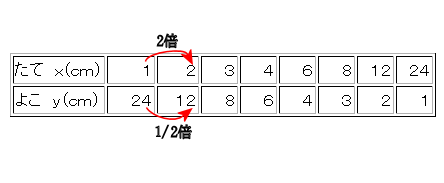 | よこ y(cm) | 24 | 12 | 8 | 6 | 4 | 3 | 2 | 1 |