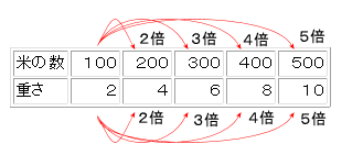 米の数が2倍3倍4倍となるにしたがって重さも2倍3倍4倍となっています。