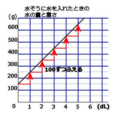 水の量(L)が1増えると、重さ(g)は100ずつ増えることが分かれば