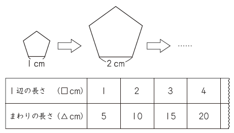1辺の長さを□cm、回りの長さを△cmとして、