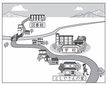 3, としやさんは、家から学校までの前の道を通って図書館へいきます。