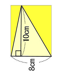 | なんだか変な形です。 でも、右の図のように向きをかえてみると、わかります。 こうして、2つ合わせると長方形ができるのです。 底辺8cm、高さ10cmの長方形です。 この長方形の面積を求めて、半分にすれば面積がでます。 だから、面積は 8×10÷2=40 答 40平方センチメートルです。 |