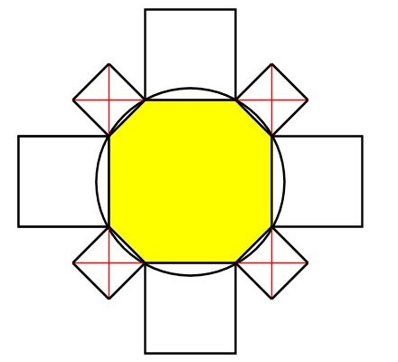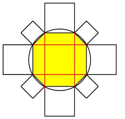 大きさの異なる2種類の正方形と円を図のように組み合わせました。